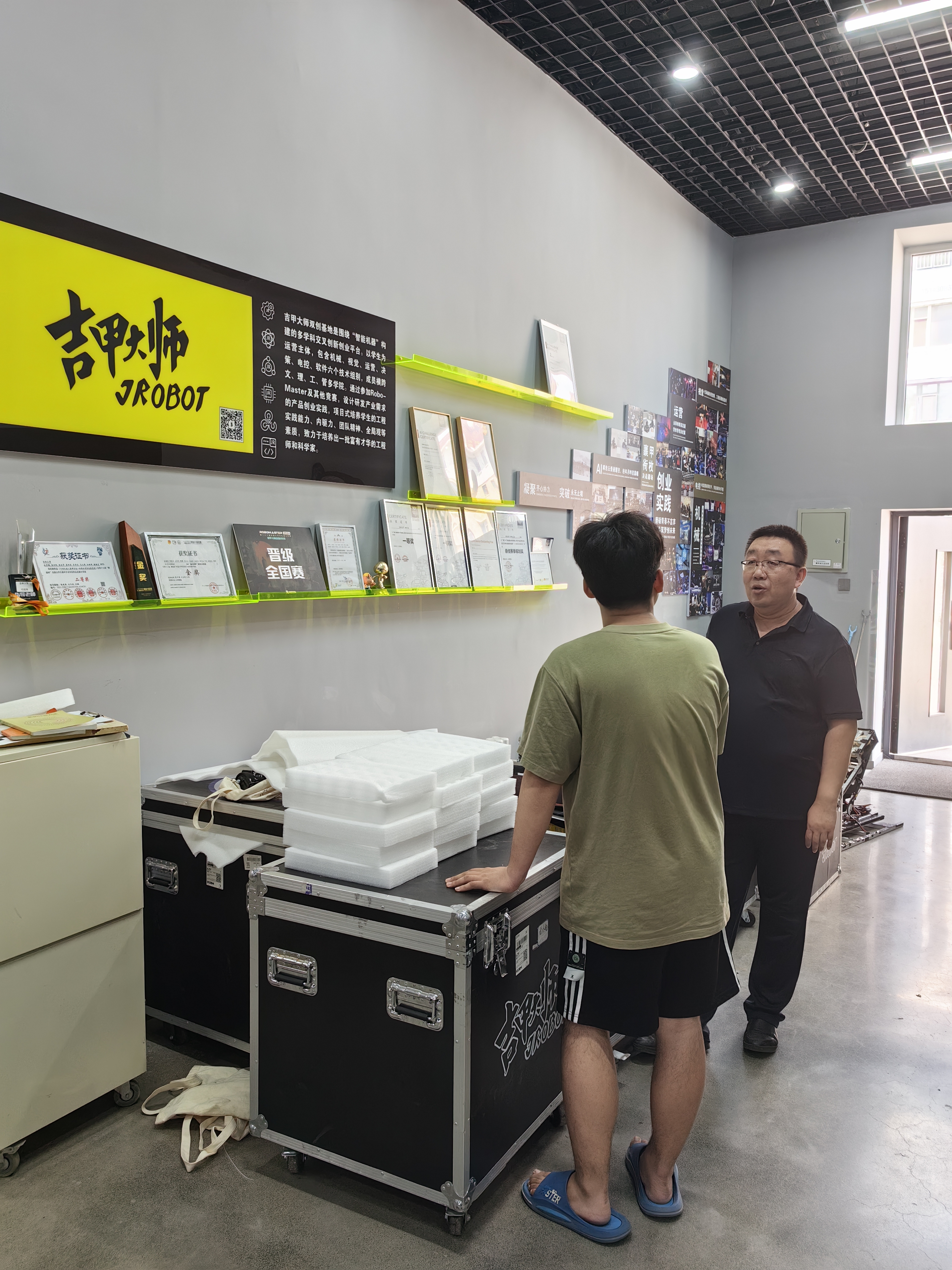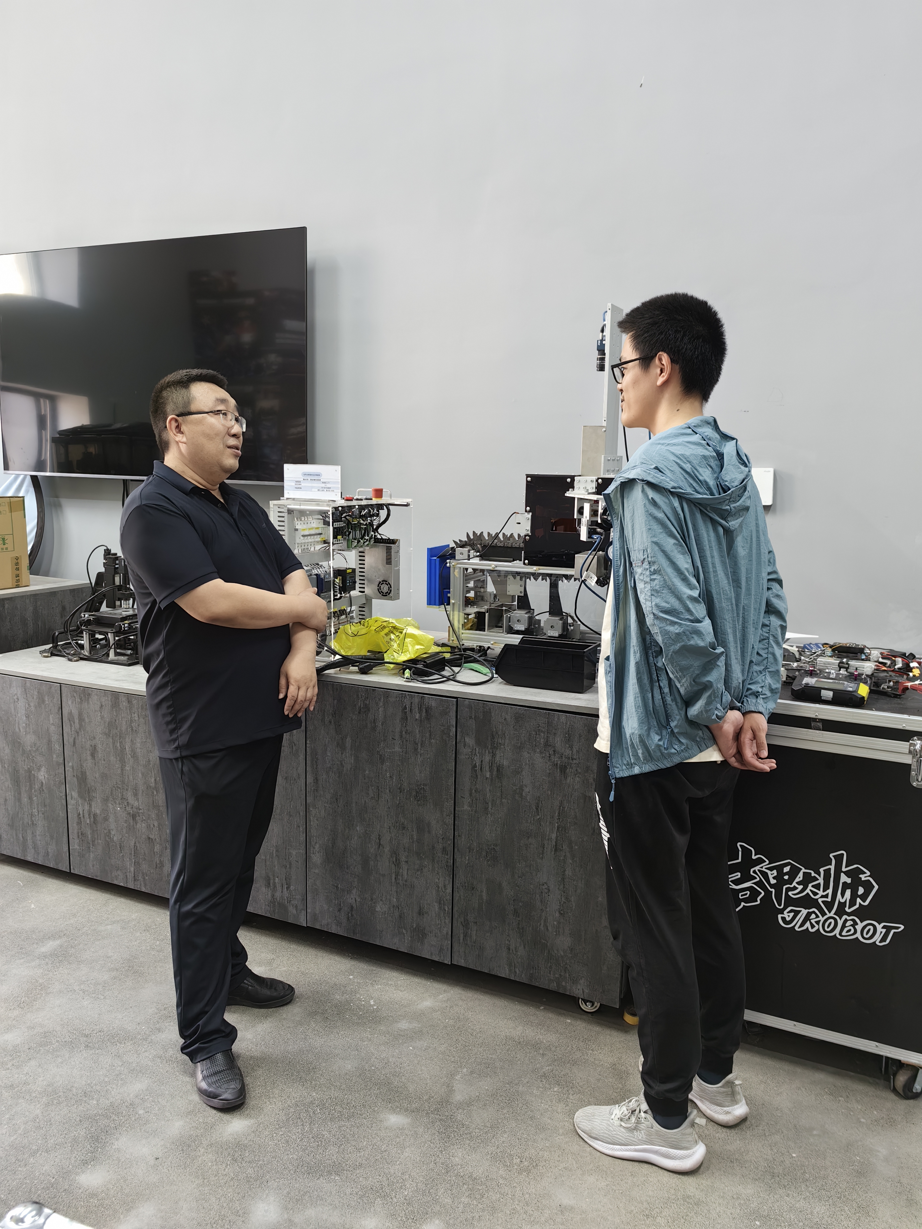 柴华老师深入吉甲大师基地,与假期留校准备参加全国大学生机器人大赛RoboMaster机甲大师对抗赛的学生亲切交流。详细了解了参赛团队的备赛情况,代表学院为同学们加油鼓劲、提振士气,激励他们要勇闯新高,为校争光。