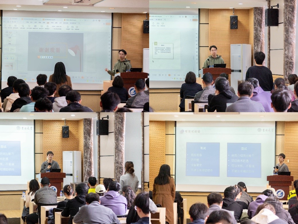 会上,陈同学围绕华为求职展开分享。他系统阐述了华为的求职流程、笔试面试要点与考题范围,以自身及室友实例剖析面试技巧,提醒同学们要依据应聘部门针对性学习相关知识,提升自身竞争力。