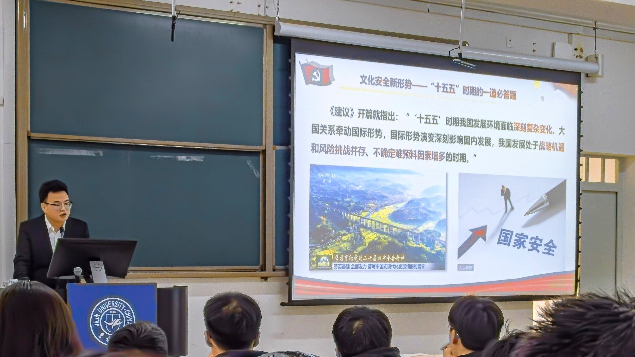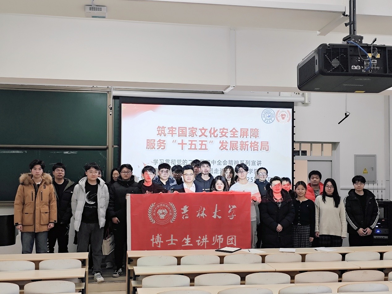 博士生讲师郝永恒以“筑牢国家文化安全屏障,服务‘十五五’发展新格局”为题,为研究生们进行了深入讲解。他结合自身专业背景,从文化视角系统解读了党的二十届四中全会提出的“坚持统筹发展与安全”的重要原则。宣讲中主要围绕文化安全的重要意义、战略路径与青年担当三个层面展开。在讲解中,郝永恒指出,“十五五”时期是我国现代化建设进程中的关键阶段。在这一承前启后的历史时期,必须从战略和全局的高度,深刻把握文化安全在民族复兴伟业中的特殊地位与重要作用。他强调,要牢固树立并持续增强文化自信,不断筑牢意识形态领域的安全防线,为国家长远发展与民族永续兴盛奠定坚实的思想根基、提供强大的精神支撑。针对青年学子的思想行为特征,郝永恒特别指出,面对信息时代背景下思想文化交流交融交锋的新态势,新时代的青年学子更应主动提升辨识能力,保持清醒头脑,坚定立场方向。要自觉肩负起继承发扬先进文化、守护国家安全特别是文化安全的神圣责任。他以深厚的理论功底和鲜活的现实观照,生动地展现了维护文化安全的深远价值与丰富意蕴。